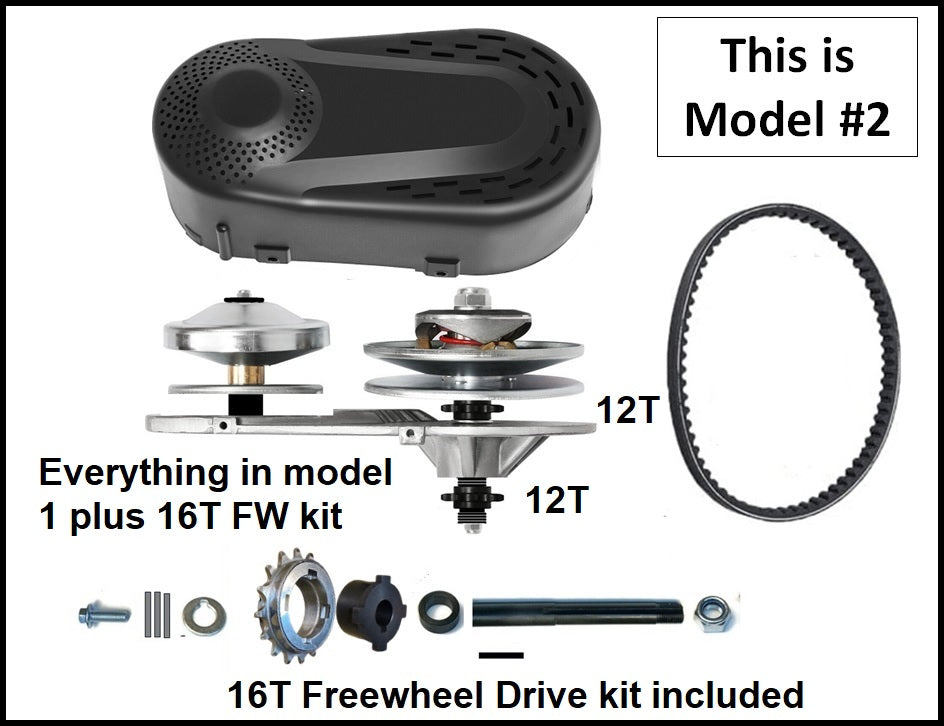 Model #2 CVT transmission with a 16T Freewheel and also includes a 12T solid chain drive sprocket for Harbor Freight 4 Stroke 79cc PREDATOR Engines!