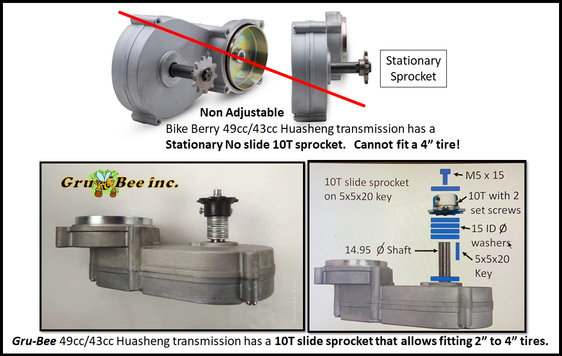 Check out the main difference between BikeBerry's stationary sprocket version of the JaiLi Transmission and the Gru-Bee version.