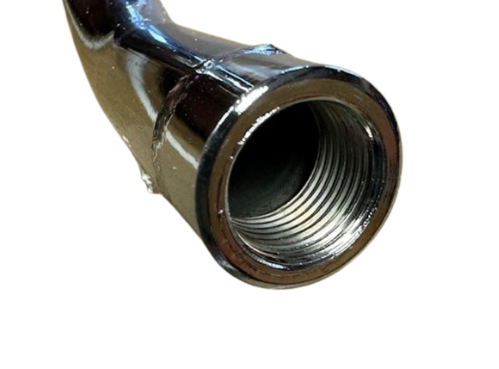 1/2" NPT threaded end that accepts our two-stroke engine screw in muffler, or you can use a Briggs and Stratton lawn mower screw in muffler.