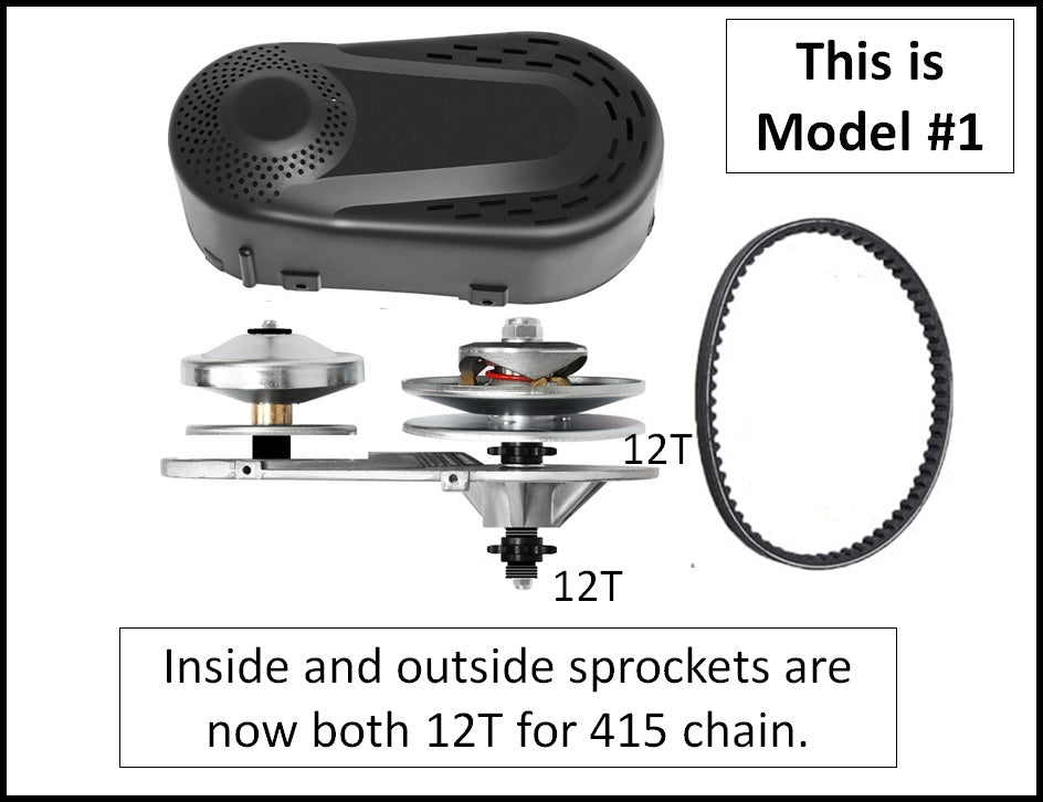 This is the Basic CVT Transmission Model #1. that has a 12T chain solid drive output sprocket for Harbor Freight 4 Stroke 79cc PREDATOR Engine and 100CC clone!